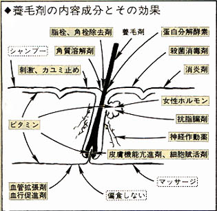 育毛剤の成分を調べてみると、いままではその薬効を「抗男性ホルモン効果」「毛細血管の拡張と血行促進」「皮脂除去。皮脂腺の活動抑制」「毛母、毛乳頭など毛根部の細胞の活性化」「その他新陳代謝の活性化、保湿、フケ止め、栄養補給など」というように、主として5つに分類していましたが、毛の培養ができるようになってからは、組織、器官の再生なども研究の対象になり、現在では次のような項目について研究がすすめられています。