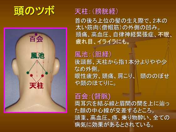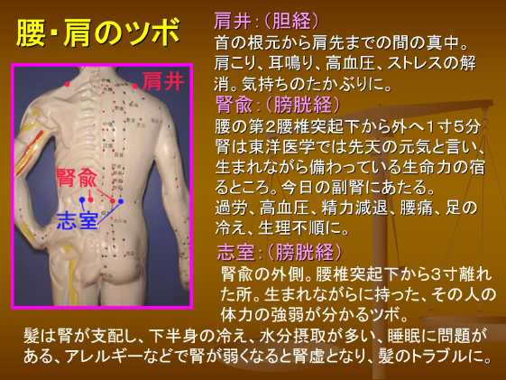自分自身の生理機能を高めるための手軽な方法としては「ツボ刺激」で、指圧などでツボそのものを刺激したり、シャンプー中にツボを刺激をすることにより頭皮の機能を高め、抜け毛を防ぐとともに、髪の発育をはかります。